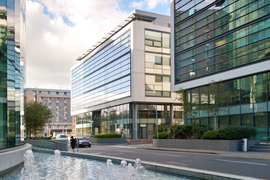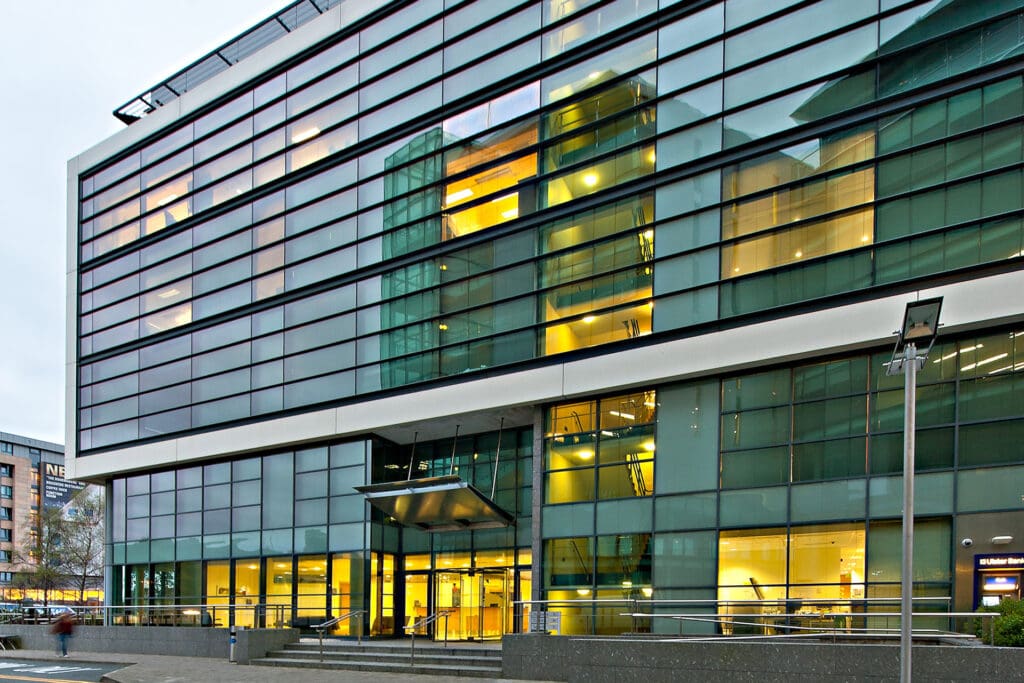 The building has been fitted out to a high standard to include a gym and café as well as a spiral staircase and bridges through the atrium linking either side of the floor plate.
